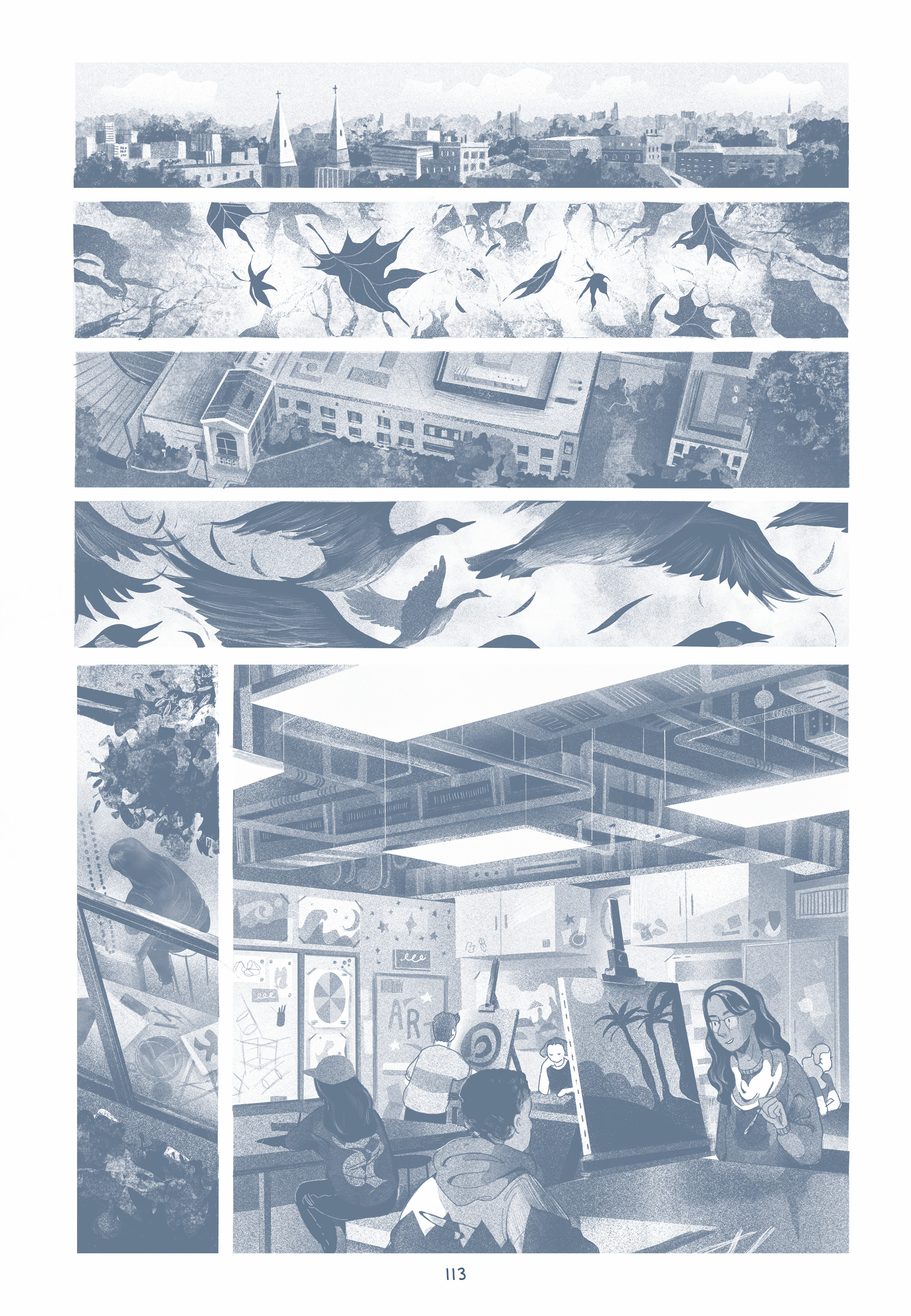 In Limbo bénéficie d’une véritable fluidité narrative, avec un découpage soigneusement travaillé : taille et formes des cases varient en fonction des circonstances, sans perdre le lecteur. Les dessins, réalisés « sur un Ipad et un Iphone à l’aide de Procreate et d’Adobe Photoshop et des photos prises par un Canon DSLR et un PhotoBooth » comme l’annonce le paratexte de l’album, sont résolument réaliste dans leur représentation des personnages et des décors, avec le choix d’utiliser une teinte bleutée uniforme pour l’ensemble du récit. Le recours à l’informatique n’empêche pas le graphisme de posséder une identité propre, avec une attention particulière pour l’expression des personnages et les détails dans les planches.