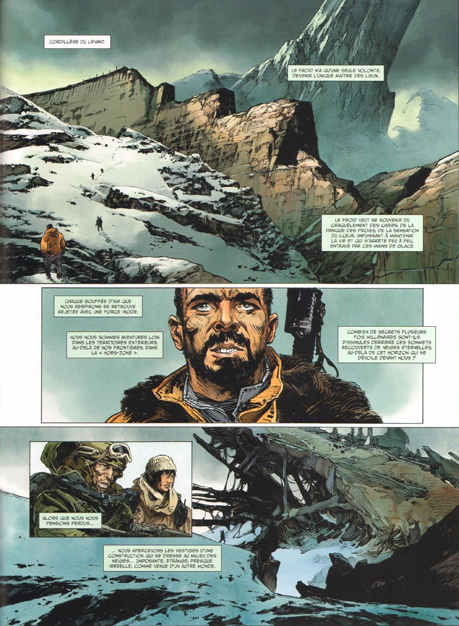 Critique : En achevant Zero Absolu et Bunker, Christophe Bec devait probablement sentir qu’il n’en avait pas fini avec cette ambiance de soldat confronté à l’infini, au froid et aux hauteurs. En relisant un vieux (ou un nouveau d’ailleurs) numéro de Metal Hurlant, il s’est éventuellement dit qu’un ouvrage se devait d’être ambitieux, pouvait être plus qu’une simple bande dessinée, pour exprimer ce qu’il avait déjà ébauché, mais pour le sublimer cette fois : de la montagne, de la glace et des roches, une nature griffée par le temps et les éléments, non pas sculptée par l’homme. Toutefois, Bec y a introduit ses mercenaires sans visages, ses éclaireurs armés aux gilets de kevlar et aux lunettes de visée, mais sans les développer, sans les faire aimer ou vraiment s’entretuer, si ce n’est dans des nouvelles qui ne sont pas sans rappeler un Ravage ou La Route pour l’atmosphère, une s’intitulant par ailleurs Metal Hurlant et donnant une indication très efficace pour expliquer ce nom. Quelques héros et héroïnes épars viennent ajouter une touche de récit mais sans volonté de les détailler, de les poursuivre, car ils ne sont qu’adjacents dans cette œuvre, et non protagonistes.
