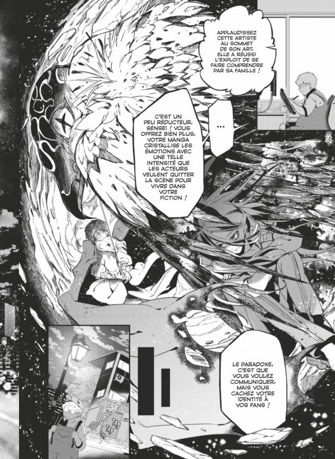 Ce qui commençait comme un seinen de fantasy s’est vite transformé en un thriller fantastique qui a évoqué chez nous une tension semblable à nos lectures de Enki Bilal ou Blue phobia de Eri Tsuruyoshi. La frontière se trouble entre réalité et fiction pour Tsugumi, et pour nous par la même occasion, dans cette quête qu’elle mène pour sauver ceux qui lui sont chers. A travers cette histoire se pose la question de la source de la création, où se trouve-t-elle ? Plusieurs débuts de réponses sont apportés par Makasu qui demandent à être digéré.