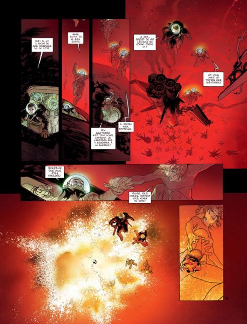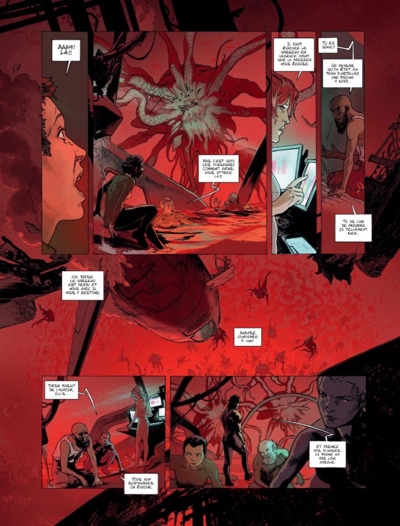 Cette histoire est amenée d’une main de maître par Thibaud de Rochebrune, qui a peut-être été initié au trait de Bajram pour cet opus, tant leurs deux styles semblent se confondre. Dans des pages magnifiques, où le lagon a tantôt des allures de gorge des enfers et à d’autres de porte du paradis, il y a un héritage d’Universal War One qui n’est pas loin (surtout les premiers albums, très sombres). En choisissant d’alterner bleu, vert, jaune et rouge pour interpréter les quatre éléments, la dimension graphique de l’objet passe au premier plan à de nombreuses reprises, tant le décor est important, car caractéristique de quelque chose de plus grand, de plus vaste, de plus ambigu aussi… En effet, le plus calme n’est pas le moins dangereux, et le plus affolé peut se révéler le plus sage dans cette histoire où les grimaces ont leur importance.