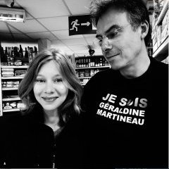 La photographie noir et blanc provient du tournage de l’un des courts-métrages Supermarket. Pierre Dugowson est au côté de l’actrice Géraldine Martineau (Copyright Cosmonaut 391).