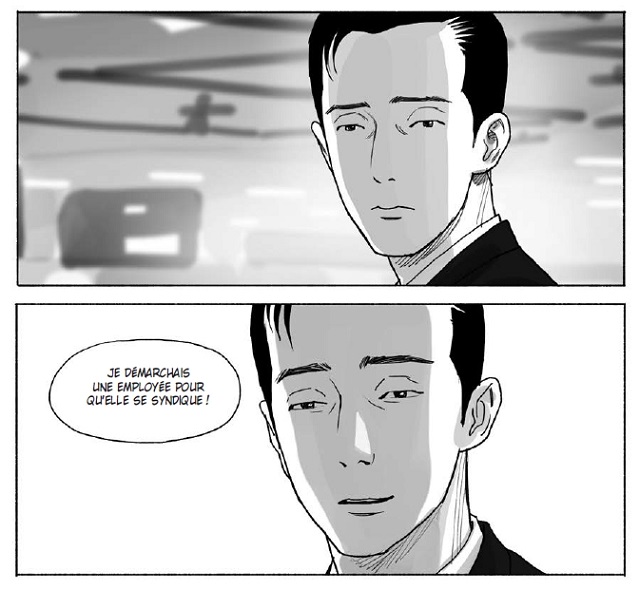 Après un premier tome centré sur la mise en place du système de harcèlement dans l’entreprise et ses conséquences, le deuxième volume d’Intraitable se focalise essentiellement sur la difficile création d’une section syndicale dans la société Fourmis, nom d’emprunt qui désigne en réalité la multinationale Carrefour qui s’est implantée en Corée du Sud au début des années 2000. La Corée du Sud est victime à cette époque d’une importante crise économique qui provoque des vagues de licenciements. Au sein des entreprises, la direction fait tout pour dégraisser les effectifs à moindre frais, quitte à harceler les employés. Choi Kyu-sok met à nu avec une grande finesse l’engrenage qui conduit à la mise en place de ces pratiques managériales.