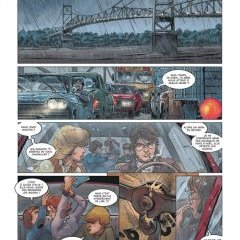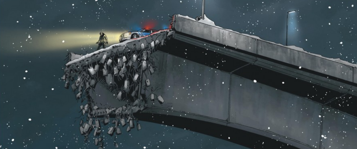 Déjà connu pour la série Goblins ou la série Hedge Fund que nous avions chroniquée ici, le scénariste Tristan Roulot revient avec Irons. Ce premier album pose les bases d’une série qui repose beaucoup sur son personnage principal. Jack Irons a des notes de Sherlock Holmes (le titre de ce premier opus ingénieur-conseil annonce d’ailleurs la couleur) accompagnées de quelques touches du Docteur House. C’est un personnage antipathique au possible archétype du anti-héros brillant mais asocial comme on les aime. On va prendre plaisir à le suivre avec curiosité et envie d’en apprendre plus sur lui mais aussi dans son domaine. Car oui, nous l’avons dit, Irons parle de ponts, c’est central dans ce tome en tout cas. Ça parle technique, on retrouve un petit côté Superstructures, la série documentaire. Mais cette série reste avant tout un thriller qui emmènera notre héros à découvrir les secrets de la destruction du pont.
