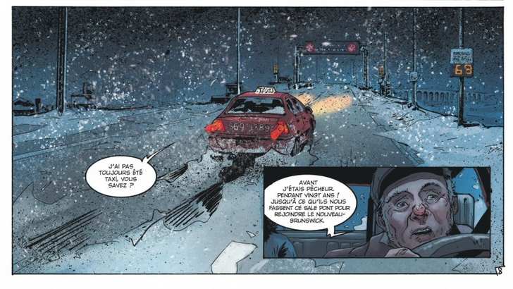 Les dessins sont servis par Luc Brahy (Les fantômes du passé, Cognac…) et Hugo Facio aux couleurs qui signent une œuvre parfois sombre à l’ambiance film noir, parfois légèrement plus colorée avec une tendance bleue et noire bien ancrée mais avec un rythme plus rapide. On retrouve les ingrédients des scènes policières de nuit, les gyrophares, les ombres, la neige. L’ensemble tient la route, est plutôt détaillé, jusqu’au nez légèrement rougeoyant à cause du froid canadien, il fallait y penser mais c’est ce genre de détail qui rajoute en immersion en s’identifiant aux personnages.
