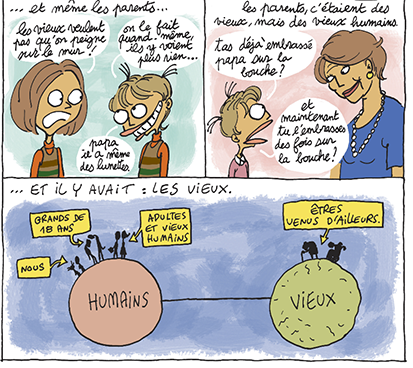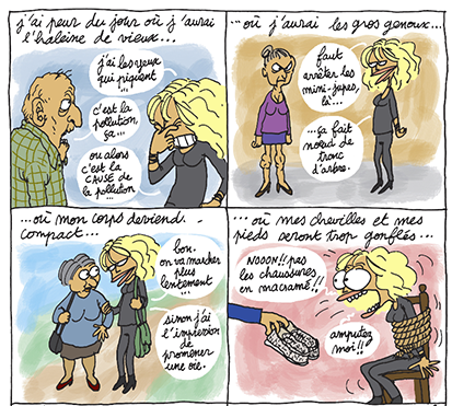 Avec un trait différent de ses albums précédents : Je veux le prince charmant, Hélène Bruller est une vraie salope ou encore Larguée, l’auteure pose les bases de ses sujets de prédilection : le rapport femme/homme et la vieillesse.