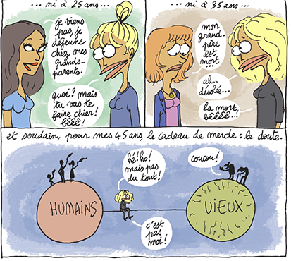 Les pendouillages de chair, les réflexions désagréables des enfants et du conjoint, le corps et l’esprit qui partent en cacahuètes, la décrépitude… Hélène Bruller ne nous épargne rien dans son nouvel opus sur la condition humaine.