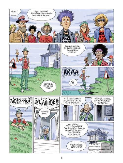 Résumé : {Jamais Le jour J} nous ramène aux côtés de Madeleine, qui habite toujours sa vieille maison en bord de falaise, sous le coup d’une menace constante d’effondrement. La situation a changé, Madeleine a trouvé un soutien grâce à Internet et sa demeure a été renforcée. De son côté, le maire est conspué par les réseaux sociaux et se trouve à deux doigts de la dépression. Mais l’histoire va prendre une direction inattendue à cause d’un simple petit chien.