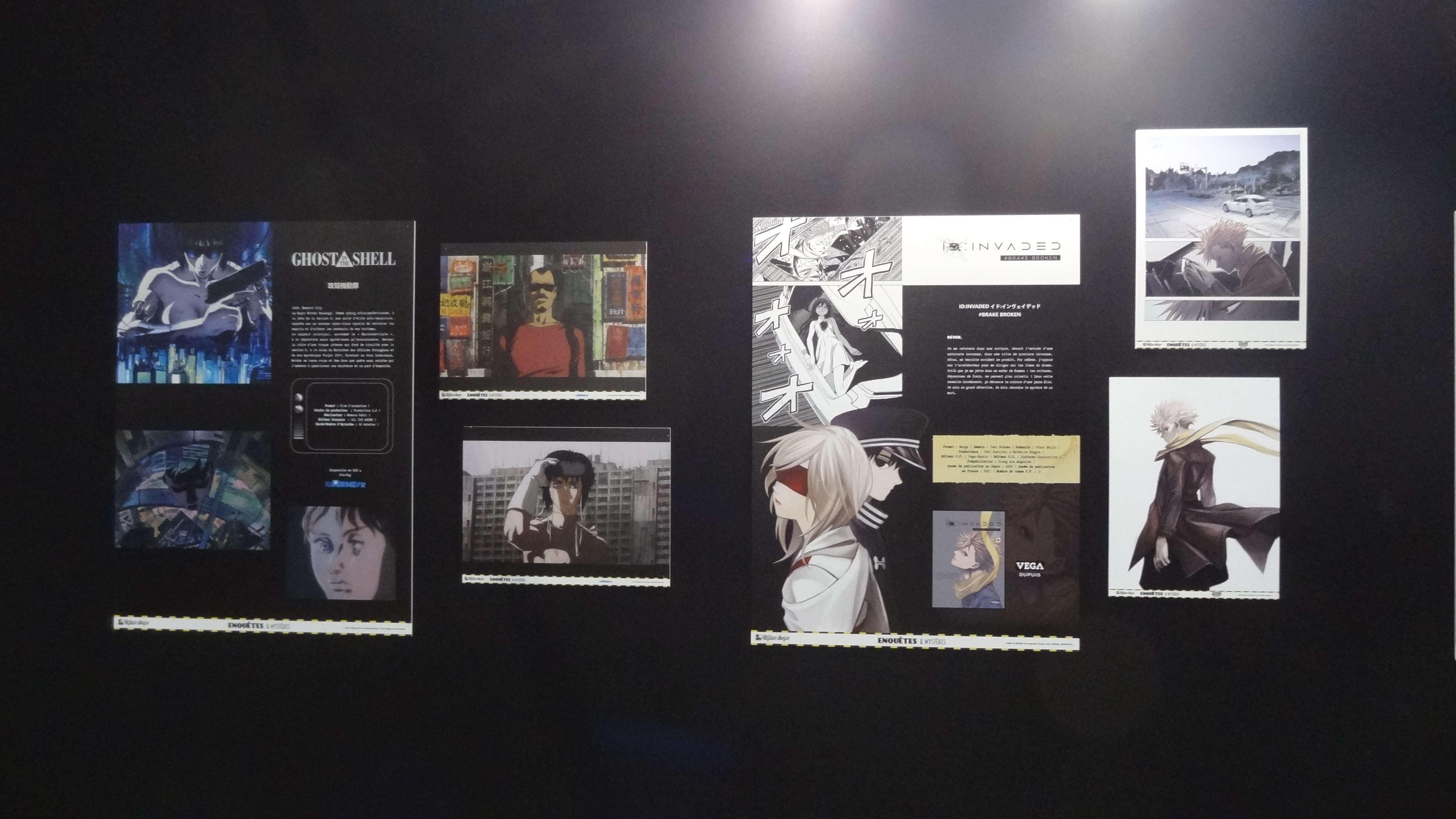 En effet, pas loin, il y avait une troisième exposition, baptisé « Meurtres et mystères ».Nous nous sommes précipités. L’exposition présentait différentes séries, liées au polar, au thriller, chacune sur une plaque illustrée. On pouvait trouver Lupin, Sherlock aux côtés de Opium Squad, Terror resonance ou encore Ghost in the shell près d’Invaded.