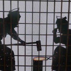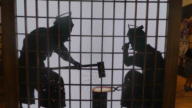 Une maison japonaise en guise de hall d’expo, avec des espaces décorés et au milieu, sous verre, des objets à regarder. Mais le plus sympathique était les animations en ombres chinoises projetées sur les cloisons à la japonaise, comme deux forgerons travaillant sur une arme.