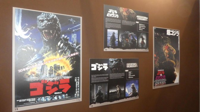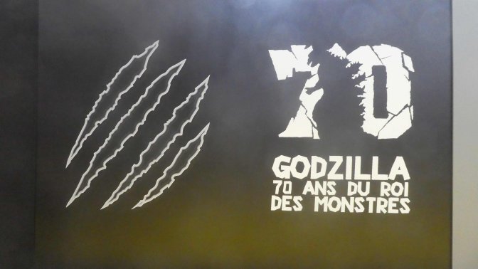 Godzilla fêtait ses 70 ans. Toujours vaillant pour un gros monstre radioactif – comme quoi, certains organismes non-humains supportent bien les radiations -, il écume encore nos salles de cinéma. L’exposition revenait sur cette carrière au long cours à faire pâlir d’envie James Bond. Chaque film était présenté avec ses affiches originales, ses titres dans différentes langues, ses résumés et bien sûr des photos extraites du long-métrage.