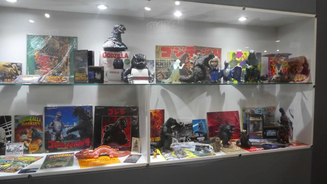 À côté de toutes ces infos et anecdotes, il y avait les vitrines de goodies autour du monstre irradié et irradiant, que l’on pouvait regarder mais pas toucher.