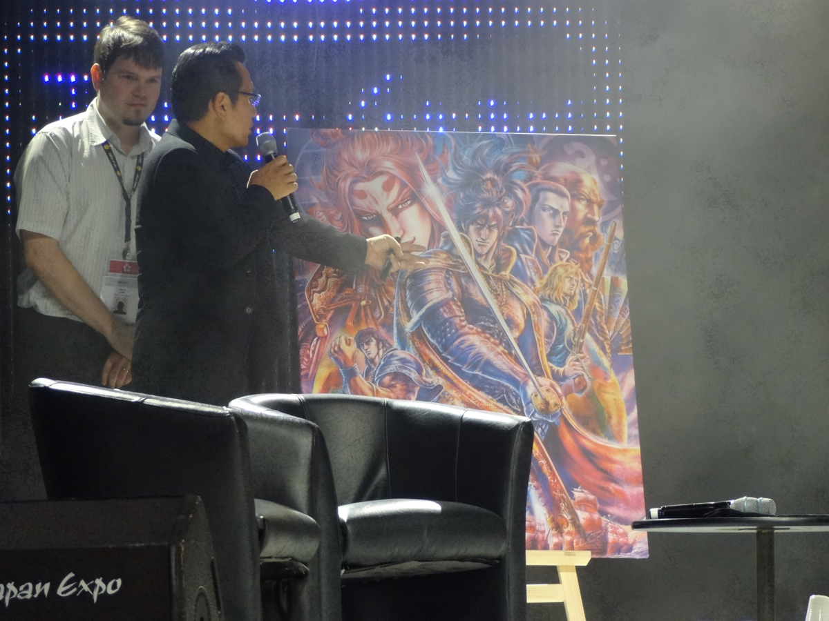 Aujourd’hui, Tetsuo Hara, est content d’être à la Japan Expo, où il est venu avec un nouveau dessin, représentant les héros de son nouveau manga. Il s’agit d’un projet historique mettant en scène le général Nobunaga, dans le Japon Médiéval. Et le mangaka de dévoiler un magnifique dessin couleur ! Belle conclusion pour cette intervention !