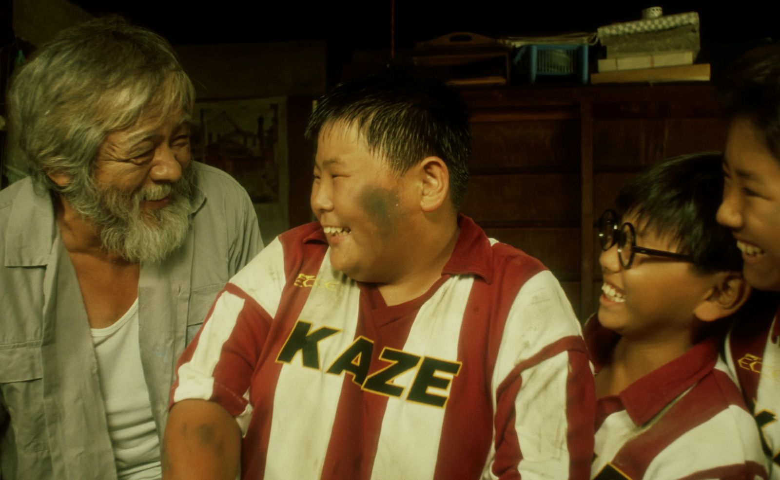 Lors d’un été caniculaire, à Kobe, trois enfants décident de s’intéresser au sort d’un vieil homme qui vit dans une maison délabrée. Entre humour noir et blagues potaches, ils l’espionnent et le pistent, et leur curiosité mal placée peut laisser croire à de la malveillance. Ils se font d’ailleurs rabrouer par le retraité lorsque celui-ci découvre leur manège. Mais la confiance réciproque finit par s’instaurer et les trois garçonnets vont même jusqu’à aider le vieux dans son quotidien : linge étendu, jardin débroussaillé, vitres remplacées… Ils l’appellent « grand-père », quand le propriétaire leur donne du « Sumo », « Lunettes » et « Tas d’os », surnoms liés à leur apparence physique… Le film n’a rien de l’œuvre consensuelle traitant en mode psychologique de l’obsession de la mort chez l’enfant ou l’adolescent, à l’instar de Jeux interdits ou Harold et Maude. Mais sa thématique est touchante, et se voit abordée dans un ton à la fois direct et décalé, réaliste et métaphorique.