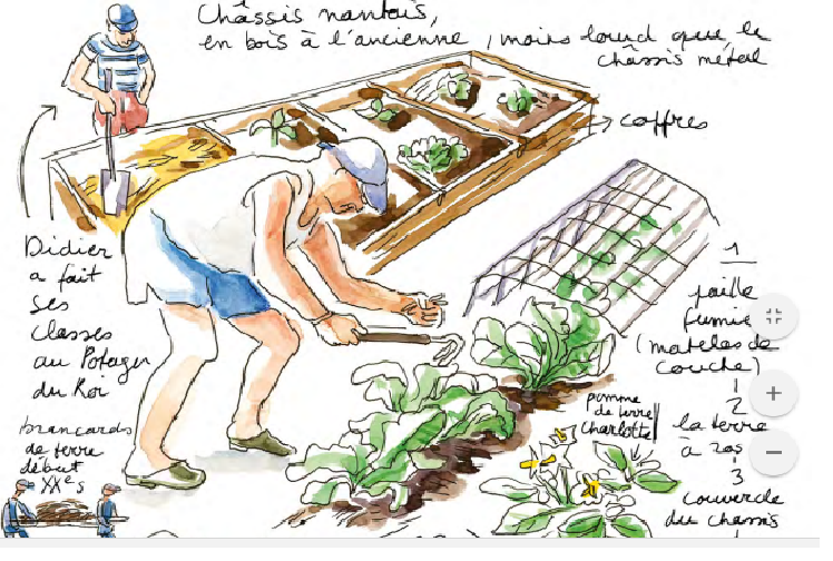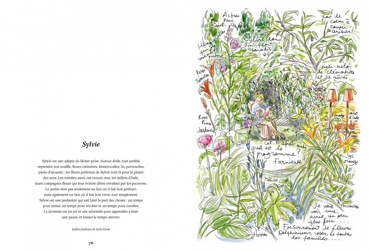 Critique : La plupart des jardins évoqués et croqués ne constituent, le plus souvent, non pas une entité propre, mais une addition de plusieurs parcelles individuelles cohabitant harmonieusement ensemble. Nous pouvons citer les jardins familiaux de Saint-Cloud (anciennement cultivés par la classe dite "ouvrière") qui vont dans ce sens et attestent d’un retour souhaité à la terre par des gens aux parcours de vie pourtant différents : l’urbanisation dévorante n’est pas finalement plus vécue comme une fatalité et cette filiation à l’agriculture, inscrite dans l’ADN de l’histoire de l’humanité depuis dix mille ans, sommeille presque dans chacun de nous. Il y a bel et bien un éveil des consciences aux bienfaits de s’adonner au jardinage pour des personnes, échappant ainsi au rythme effréné d’une capitale, au trop de bitume, au tout en béton, y trouvant un bonheur des plus louables et des plus purs. Cet exutoire se mue peu à peu en une douce habitude.