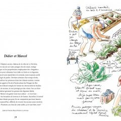 Chacune des 54 planches de croquis à l’aquarelle -nous n’allons pas les détailler- atteste d’un pinceau alerte qui a su saisir des instants d’épanouissement, avec souvent une drôlerie bienvenue, et est agrémentée de courtes phrases poétiques au charme souvent rafraîchissant, mais aussi à vocation parfois didactique. Chacune des 54 planches de croquis à l’aquarelle est liée le plus souvent à une seule et même personne qui nous est présentée par Raphaèle Bernard-Bacot. Cette dernière manie également, avec une spontanéité et une simplicité toutes deux merveilleuses, l’art du récit. Tout est si naturel et nous rend attachants ces amoureux de la terre, dont le prénom seulement est mentionné. Le lecteur du livre Jardiniers des villes se sent, en effet, très proche de ceux qui pourraient être ses voisins de quartier. Le jardinage recèle, de surcroît, des vertus : la relaxation, le choix d’une seconde vie, l’inventivité, l’exercice, etc.