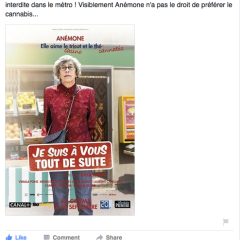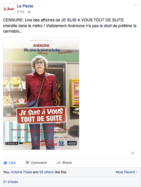 Je suis vous tout de suite se veut en effet irrévérencieux et semble avoir beaucoup d’atouts comiques. Ce film réalisé par Baya Kasmi, que l’on connaît comme scénariste d’Hippocrate et du truculent Le Nom des gens, qui s’inspirait de sa personnalité excentrique irrésistible, ose aborder des thématiques complexes, entre religion ou la place des femmes dans la société, au travers de ressorts humoristiques qui gênent ces messieurs bien-pensants de Media Transport. Le distributeur Le Pacte et l’attachée de presse du film ont ainsi révélé le nouvel affront fait à la liberté artistique et à la création, via le refus du réseau publicitaire d’afficher un visuel personnage représentant la vieille dame indigne d’Anémone, qui évoque le mot tabou de "cannabis".