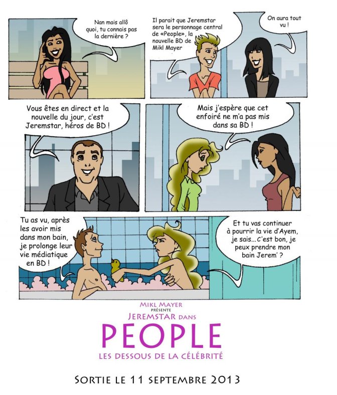 Jeremstar, "la célèbre" star qui fait des interviews dans son bain se lance dans un projet BD ! Une bande-dessinée dont il sera lui même le "héros". On n’est jamais aussi bien servi que par soi-même. Et qui s’appelera "People, les dessous de la télé réalité". Autour de cette immense star, d’autres non moins immenses star de la télé réalité. Je cite les délicieuses Nabilla, Ayem, Amélie accompagnées des gracieux Benoit, Thomas, Chris Bieber et Zarko. La quintessence de ce qui se fait de plus hot dans les boites de nuit de l’hexagone.