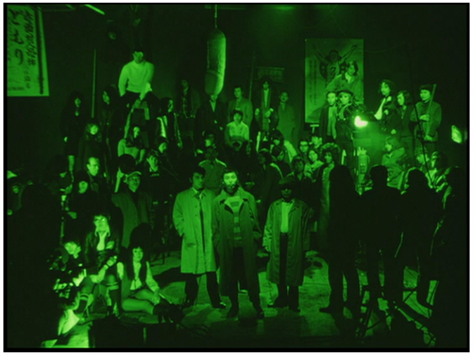 Les personnages n’hésitent pas à s’adresser directement au spectateur, comme le protagoniste au début ou à la fin (Moi je peux fumer, vous pas), voire proférer, à l’instar du chanteur de Cache-cache pastoral, de sombres menaces à son encontre : Transmettez au plus vite ce message à cinq personnes, sinon vous mourrez, nous dit l’un des intervenants lors de l’étonnante séquence des petites annonces qui voit défiler à l’écran une dizaine d’hommes en quête de l’âme soeur. Et, pour brouiller définitivement les frontières entre fiction et réalité du tournage, un panoramique de plusieurs minutes fera se succéder en gros plans les visages de tous les membres de l’équipe en guise de générique de fin.