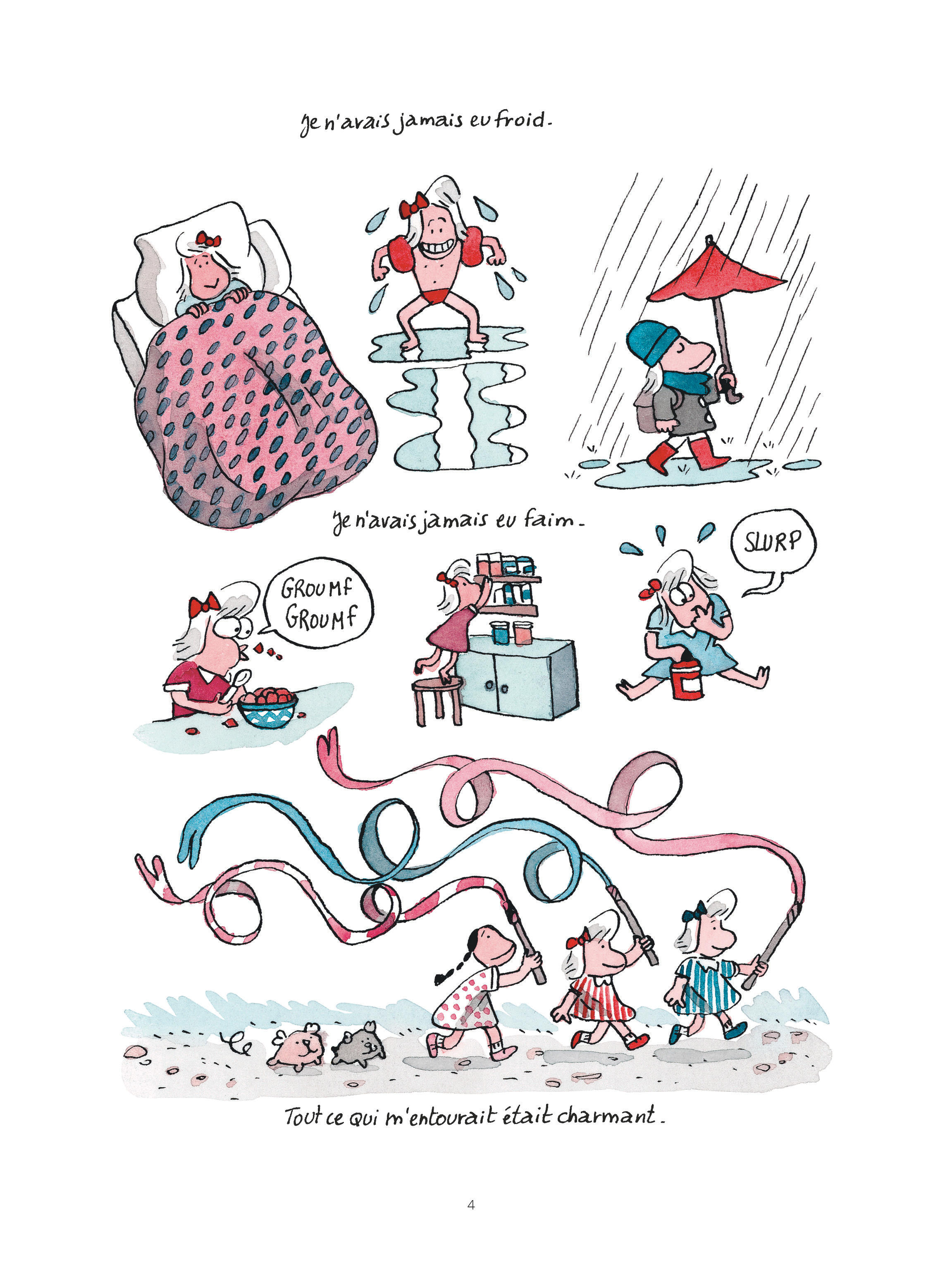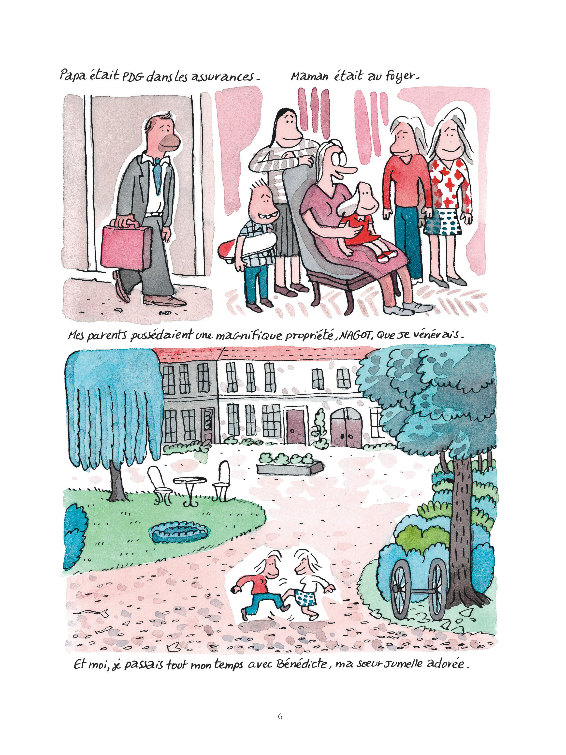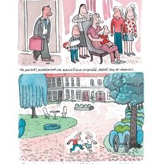 Comme à l’accoutumée, l’autrice entremêle talent d’écriture (vocabulaire précis, parlant, drôle et touchant), humour grinçant, vivacité du trait, poésie du dessin et de sa mise en couleur aqueuse. Son récit, toujours très vivant, est direct, intense et cru. Le dessin semi-réaliste joue volontiers sur des formes simples et des éléments tenant de la caricature ; il est le véhicule idéal pour la colère déroulée au fil de ces pages. Cette dernière s’exprime tour à tour de manière feutrée ou explosive, tant dans ce qui est raconté que dans la manière de le faire. Florence Dupré la Tour n’épargne personne, à commencer elle-même et sa volonté de ne rien laisser transparaître, comme sa difficulté à descendre ses parents de leur piédestal.