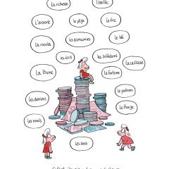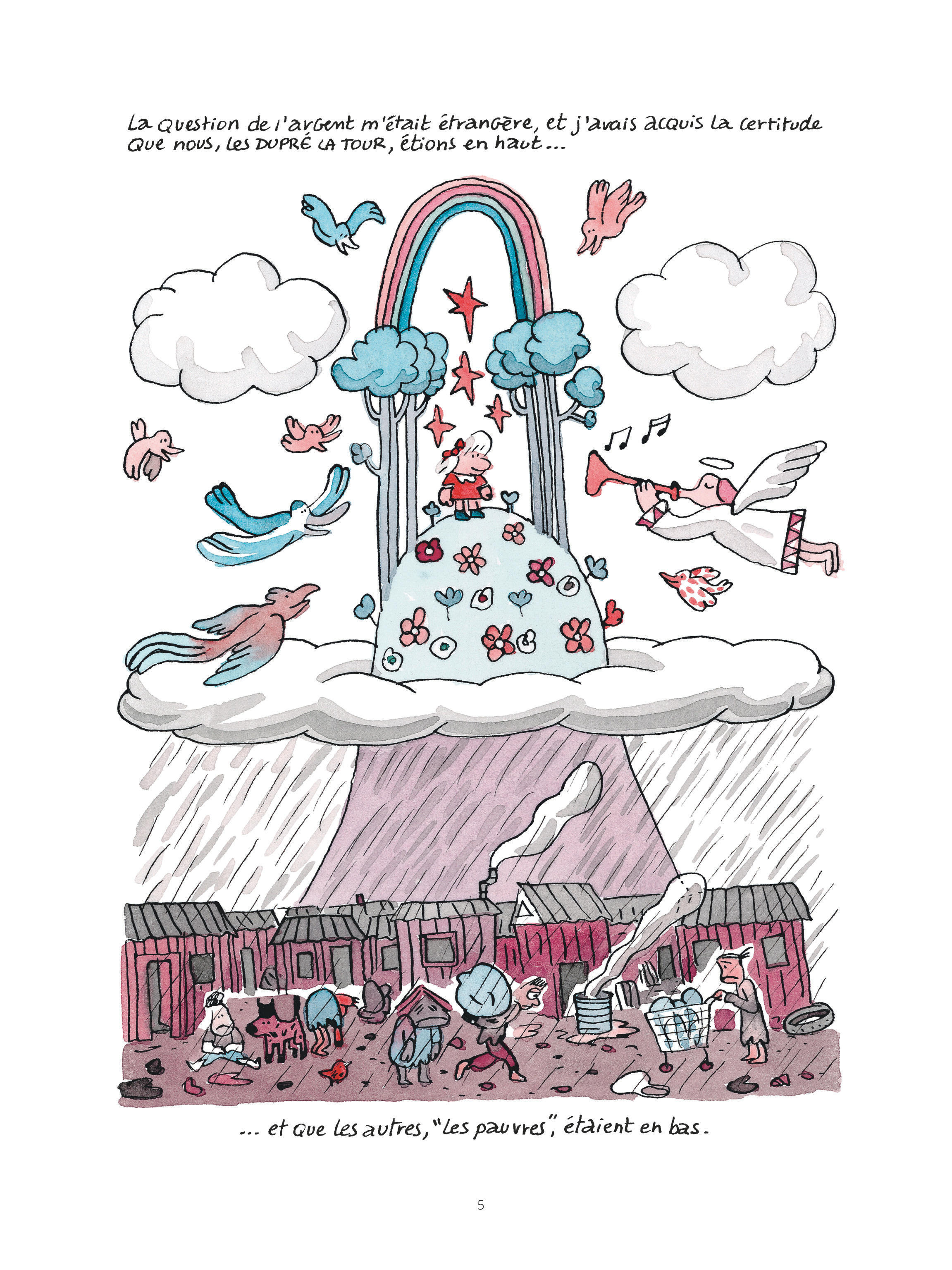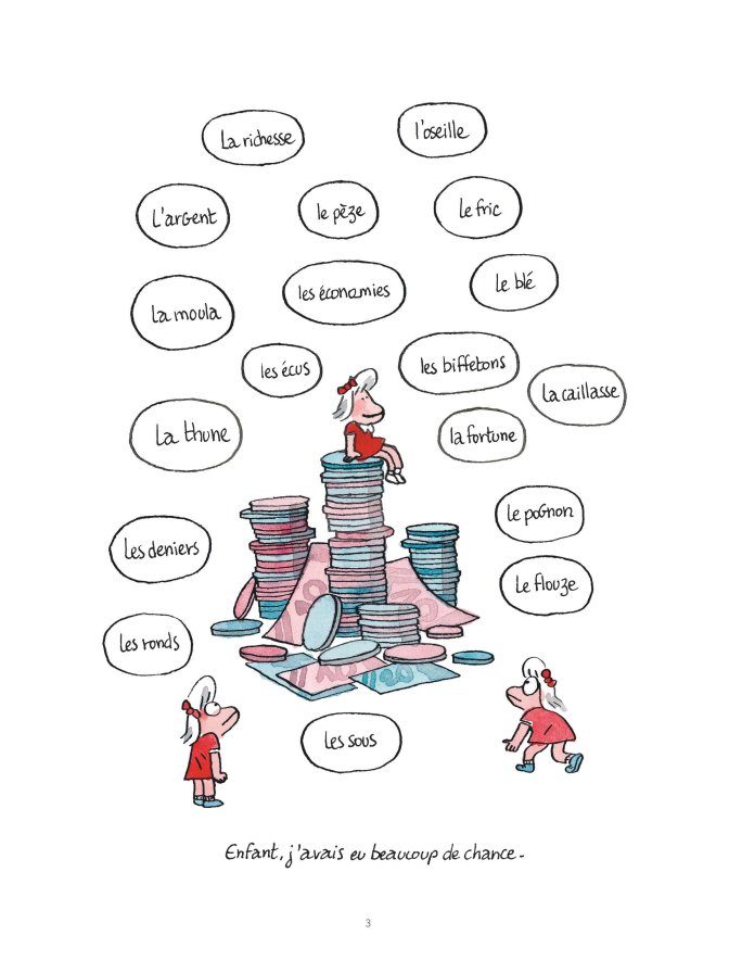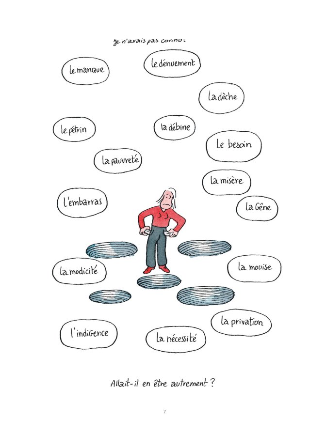 Plus largement, cette bande dessinée développe une réflexion nourrie sur le déclassement social et sur la pauvreté. Elle ne manque pas d’évoquer certains adages (tels que « mieux vaut être riche et en bonne santé que pauvre et malade ») tant elle illustre les inégalités sociales qui se nichent dans des éléments essentiels de l’existence : un rendez-vous médical, un accouchement, les discussions entre parents à la sortie de l’école, l’accueil chez soi d’amis de ses enfants… Le microcosme de la BD n’est pas épargné, qu’il s’agisse du rapport à l’argent ou de la dimension prédatrice de certains auteurs.