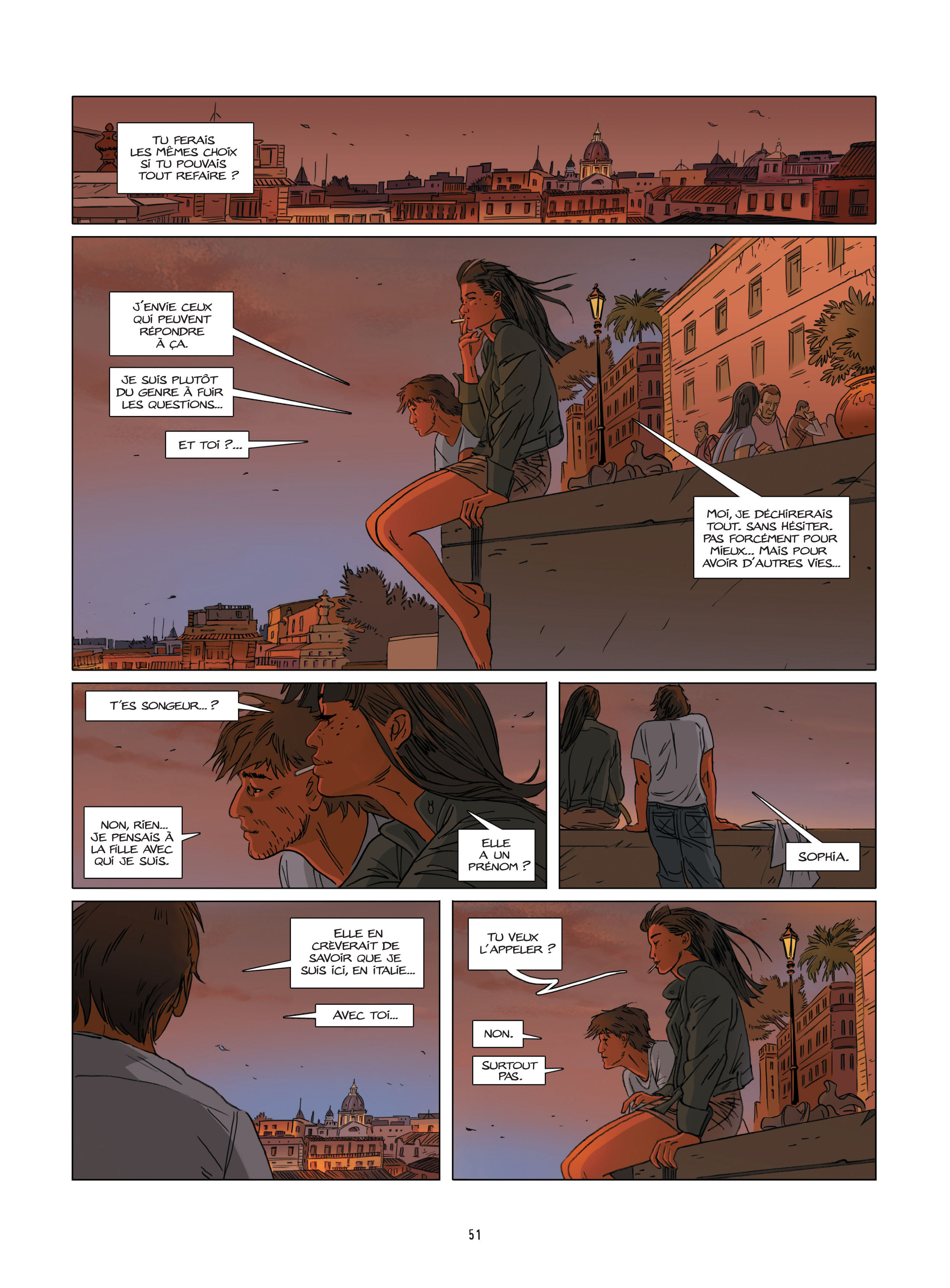 Non, je l’avais écrit bien avant. Là, j’écris le tome deux de Où sont Passés les Grands jours. En replongeant dans mes notes, j’ai vu que le personnage féminin s’appelait Marie et devait partir à Rome. Il y avait plein de petits éléments qui étaient des prémisses d’Une Nuit à Rome. Donc, tout ce qui était en lien direct, je l’ai ôté. Mais il y a un tronc commun, j’avais envie de parler de gens qui m’étaient proches. Ça n’a pas été une écriture qui chevauchait Une Nuit à Rome et qui a mis le désordre dans ma tête, car, par chance, c’était antérieur. Je ne sais pas pourquoi, curieusement, je n’ai jamais pensé que je la dessinerais un jour, cette histoire. Plusieurs copains lecteurs me disaient que c’était mon meilleur scénario alors que je ramais pour écrire Une Nuit à Rome... Je crois que j’avais envie de dessiner l’Italie et d’y plonger entièrement !