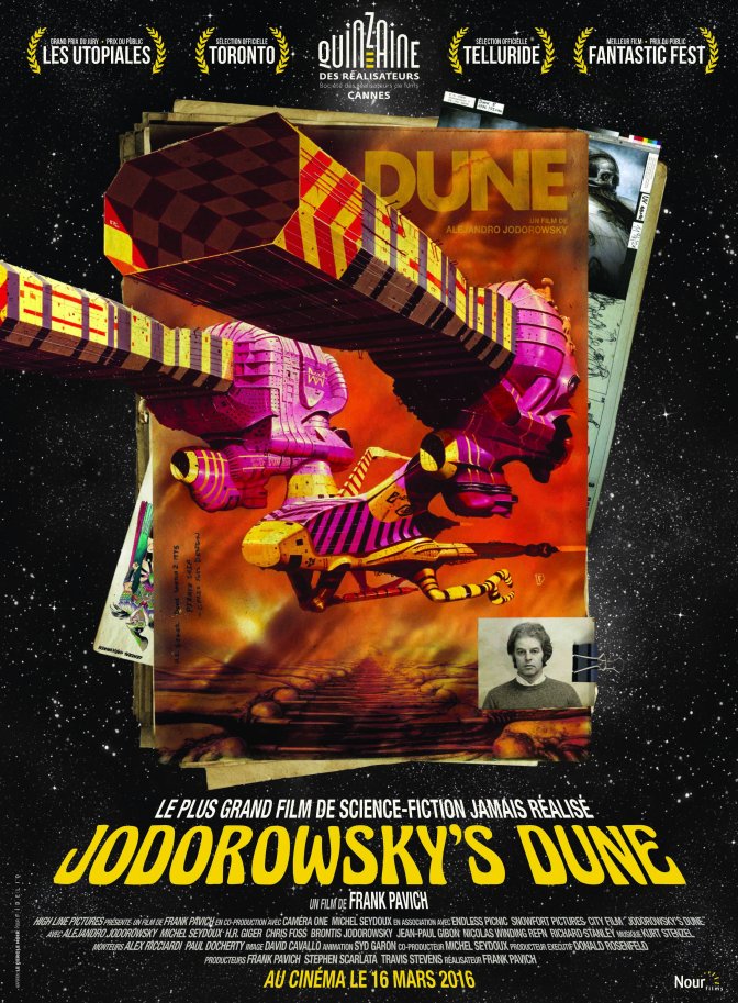 L’argument : Sorti en 1965, Dune, le livre de Frank Herbert est un succès mondial et devient le livre de science-fiction le plus vendu au monde. En 1975, le producteur français Michel Seydoux propose à Alejandro Jodorowsky une adaptation très ambitieuse de Dune, au cinéma. Ce dernier, déjà réalisateur des films cultes El Topo et La Montagne sacrée, accepte. Il rassemble alors ses « guerriers » artistiques, dont Jean (Moebius) Giraud, Dan O’Bannon, Hans-Ruedi Giger et Chris Foss qui vont être de toutes les aventures cinématographiques de science-fiction de la fin du siècle (Star Wars, Alien, Blade Runner, Total Recall etc.). Le casting réunit Mick Jagger, Orson Welles, Salvador Dali, David Carradine ou Amanda Lear, mais également son jeune fils Brontis Jodorowsky, Pink Floyd et Magma acceptent de signer la musique du film… L’équipe de production recherche 5 millions de dollars pour finaliser le budget et se heurte à la peur des studios hollywoodiens qui craignent le tempérament de Jodorowsky… Jodorowsky’s Dune retrace l’extraordinaire épopée de ce film fantôme qui devait être « le plus grand film de l’histoire du cinéma » et changer à jamais la face du 7ème art.
