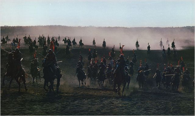 Après le générique, la « déception » continue : un magnifique travelling suit un messager qui sur son passage réveille des soldats colorés ; c’est la résurrection de l’épopée, ou celle du maître du genre. Mais ce plan qui semblait appeler le bruit et la fureur se poursuit par des discussions, des récits. Nous sommes au théâtre, dans l’intime, comme si le cinéaste nous frustrait consciemment de notre goût du spectacle. Et cette frustration se poursuit méticuleusement en des séquences longues et farcies de détails : voir par exemple ces balayeurs qui aplanissent le sol avant l’arrivée du sosie ; mais aussi par un jeu sur le point de vue : l’urne qui contient le corps de Shigen est jetée dans un lac, mais le brouillard nous empêche (et empêche les espions) de voir l’action. Kurosawa va jusqu’à expédier une bataille en plans larges, qui mêlent fumée et corps indistincts. Et le combat final, cruel et pathétique, en grande partie hors-champ, sonne comme une délivrance, celle du spectateur, celle aussi du cinéaste, qui donne la pleine mesure de son talent après des interrogations et des doutes. Kagemusha ressemble ainsi à une purge, celle de ses démons intérieurs, qui lui permettra de réaliser ensuite Ran, point d’orgue et adieu au film historique et épique.