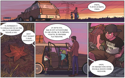 Au dessin, c’est Otocto qui a la charge de donner vie en format BD à ce style et ce personnage. D’une façon agréablement vintage, il donne un cadre universel à l’aventure, si l’on excepte la dimension parallèle aux personnages croisés avec des animaux. Une petite ville moyenne avec ses rues qui sont désertées, des enfants pas tendres avec les nouveaux, un père un peu désarmé, chaque page se lit avec simplicité et des couleurs tantôt chaudes, tantôt électriques. Un contraste charmant qui dégage une certaine animation, comme un bon clip sait le faire.
