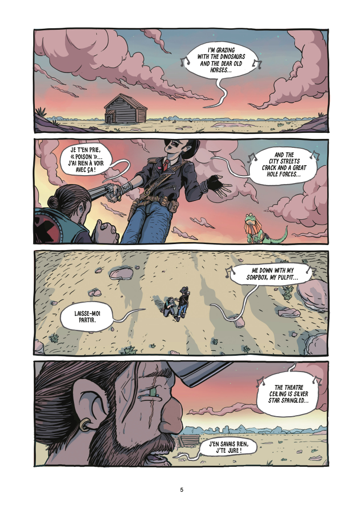 D’un point de vue graphique, cette aventure rejoindrait presque l’univers jeunesse, avec des yeux et des nez simplissimes, des vêtements et dinosaures bariolés, des armes de toutes les tailles et des méchants reconnaissables. Mais cette apparence laisse place à une lecture plus dubitative à mesure que se déploient les combats, les liens, les sentiments des personnages. On ne peut s’enlever à cette première impression, mais elle se dilue étrangement bien avec les pages de cet imposant volume.