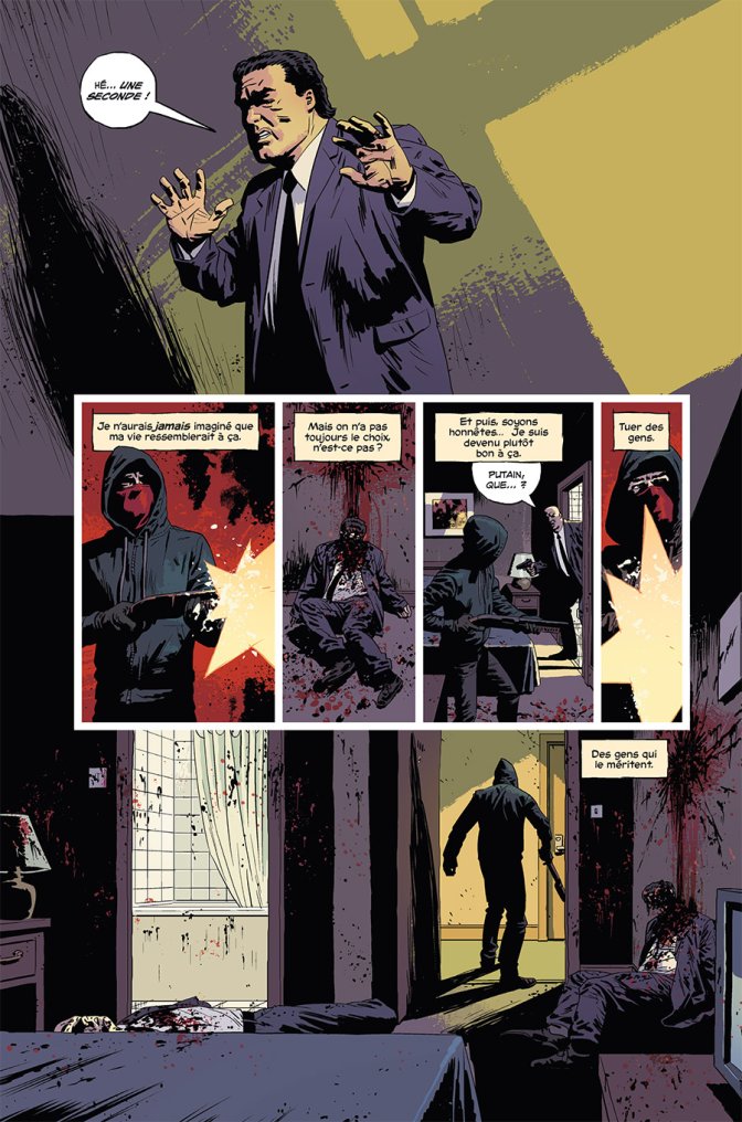 La plongée dans l’histoire de ce jeune homme se fait d’une manière sinueuse. Les digressions, retours en arrière et flash forwards s’enchaînent rapidement, avec un narrateur lui-même perdu, hagard, brusque. Comment est-il devenu un serial killer ? Quand a eu lieu son premier meurtre ? Qu’est-ce qui l’a poussé à le commettre ? Les premières questions trouvent leurs réponses rapidement, trop vite pourrait-on même dire, car l’action et les étapes s’enchaînent ou se sautent dans un chaos qui illustre à merveille celui qui fuse dans la tête du héros. La logique n’est pas la priorité, la linéarité est optionnelle, car ce récit doit révéler une histoire torturée, faite d’erreurs et de renoncements. Pourtant, les mots et les péripéties vont petit à petit s’imbriquer, le personnage va progressivement gagner en charisme, son parcours s’étoffer pour devenir sacrément happant pour le lecteur, avide de connaître le déroulé et la suite des meurtres. Car ce héros au masque rouge est bien un tueur, sorte de Dexter qui aurait croisé Faust, maladroit avec les armes comme avec les filles, un Kick Ass dépressif et surtout penchant du mauvais côté de la Justice. Et ce premier tome ne semble donner que les explications de surface de ce croisement des genres, de quoi envisager une riche suite...