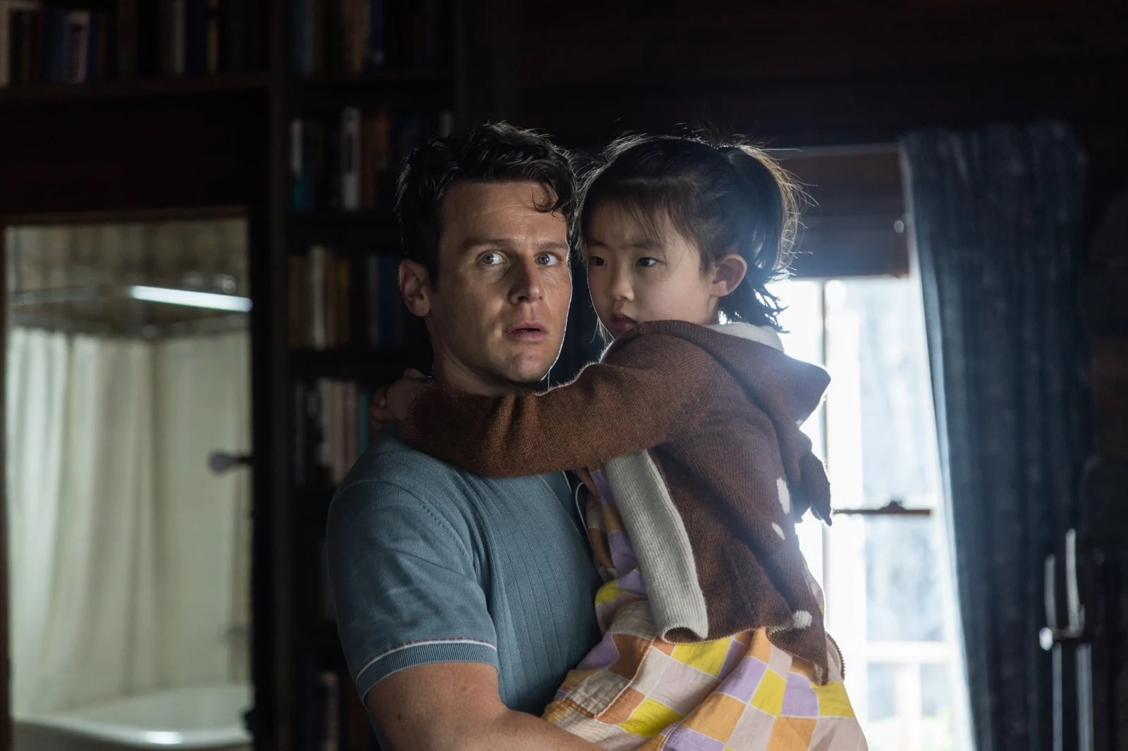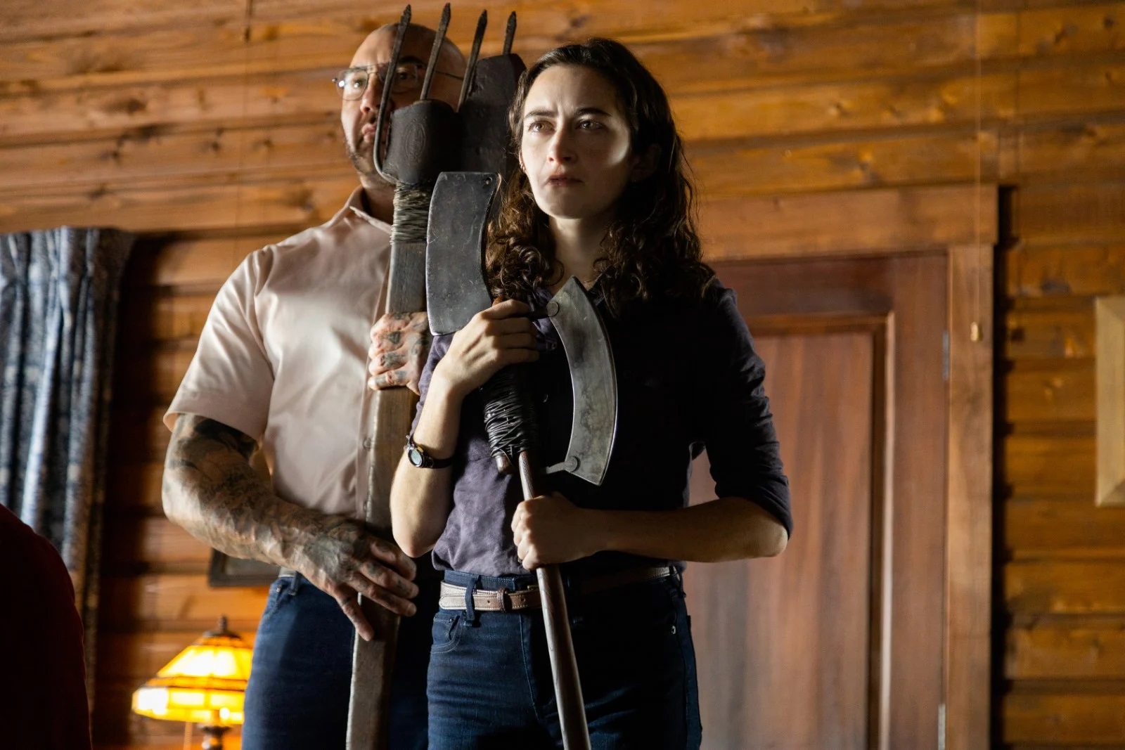Knock at the Cabin n’est pas un film d’épouvante ordinaire. M. Night Shyamalan empile dans un même récit des genres très hétéroclites, où se côtoient le thriller psychologique, l’horreur pure et la vision apocalyptique. Les héros sont confrontés au dilemme terrible de devoir sacrifier ou leur fille ou l’un des deux hommes, afin de sauver le monde. En même temps, si le dilemme constitue le fil conducteur de la narration, le scénario fait planer le doute d’une simple prise d’otage organisée par des psychopathes de première, à commencer par le chef de meute, un hideux bonhomme tatoué, qui se complaît dans des discours prophétiques, aux accents manipulateurs et empathiques. Tout est fait pour surprendre le spectateur, d’autant quand il s’attache aux personnages principaux et faillit avec eux dans le doute et l’horreur.