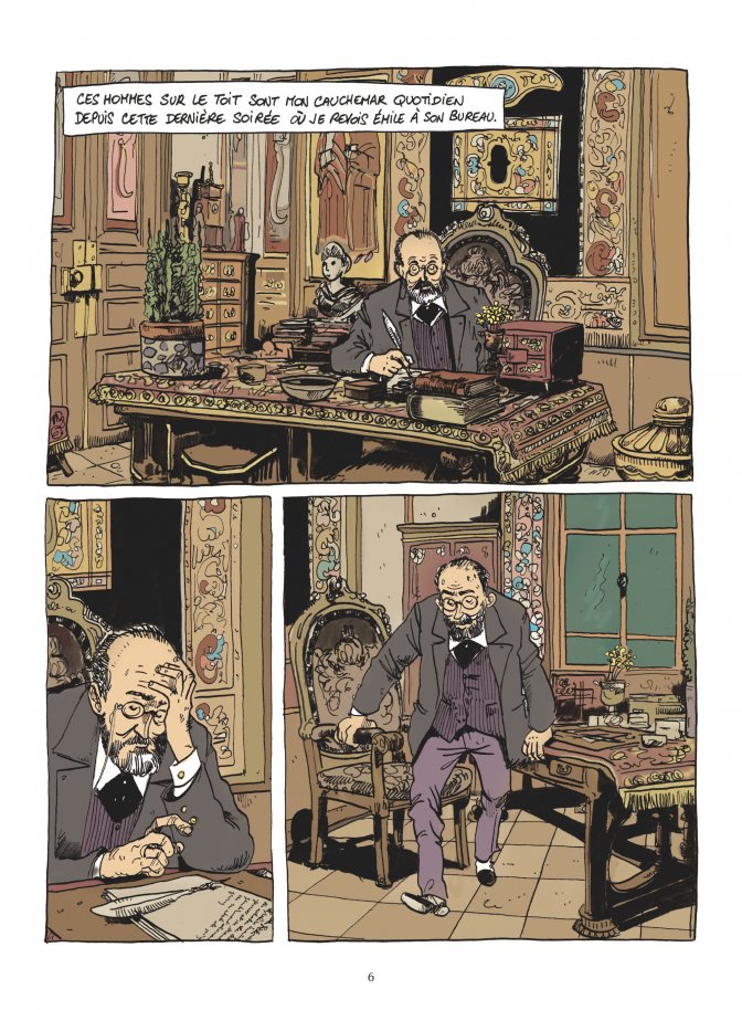 Scénarisée par l’historien et journaliste Jean-Charles Chapuzet, avec l’aide de Vincent Grave pour le storyboard, L’Affaire Zola mêle avec adresse la biographie de l’écrivain et les méandres de l’affaire Dreyfus. L’objectif est à la fois de comprendre la généalogie de l’affaire et les raisons qui ont conduit Émile Zola à prendre, au péril de sa réputation et surtout de sa vie, la défense du capitaine Dreyfus en écrivant notamment la célébrissime adresse « J’accuse » au président de la République. Les premières pages du récit montrent en effet qu’Émile Zola, écrivain à succès menant une double vie, n’était en rien prédestiné se retrouver au centre de l’affaire Dreyfus, ayant par ailleurs lui-même relayé des poncifs sur les juifs dans L’Argent. Chapuzot insiste sur les hésitations du romancier, dont l’implication s’avère par la suite totale, une fois sa décision prise de s’engager aux côtés des dreyfusards. Entretemps, le récit nous dévoile l’enfer de la vie de Dreyfus déporté en Guyane, les humiliations et les sévices qu’il subit, mais aussi sa ténacité, et la crainte paranoïaque des geôliers qui redoutent une improbable évasion.