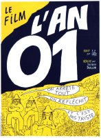On pense à un certain cinéma engagé, lisible au premier ou second degré, de La vie est à nous (1936) de Jean Renoir à Camarades (1970) de Marin Karmitz, en passant par les expériences de type Cinétract qui voyaient déjà mobilisés Resnais mais aussi Godard ou Marker. S’y rattache donc cette fable (et farce) à l’esprit très soixante-huitard, déstructurée dans sa forme, au minimalisme assumé (noir et blanc, décors...), et surtout insufflée de l’air du temps du début des seventies : contestation de la croissance, du productivisme, de l’autorité d’entreprise, de la pollution ; et promotion d’une joyeuse liberté aux parfums de l’amour libre, de la paix, et d’un bordel ambiant... L’aspect avant-gardiste du projet est tempéré par un ton et un humour café-théâtre qui permirent aux auteurs de viser une audience plus large que celle des initiés. Et c’est avec jubilation que l’on découvrira les débuts à l’écran de Balasko, Jugnot ou Coluche, réunis autour de pittoresques seconds rôles (Jean-Paul Farré, Jean-Pierre Sentier), mais aussi de Depardieu, Dewaere et Miou-Miou, le futur trio vedette des Valseuses. Découvrir L’an 01 est donc se replonger avec délices dans toute une époque de savoureuse subversion, qu’amplifie la présence dans la distribution de Georges Wolinski et Cabu, ce dernier campant un conspirateur en réunion, dans une scène rétrospectivement émouvante. En dépit de ses imperfections et de son caractère forcément daté, L’an 01 est donc une vraie curiosité de cinéphile.