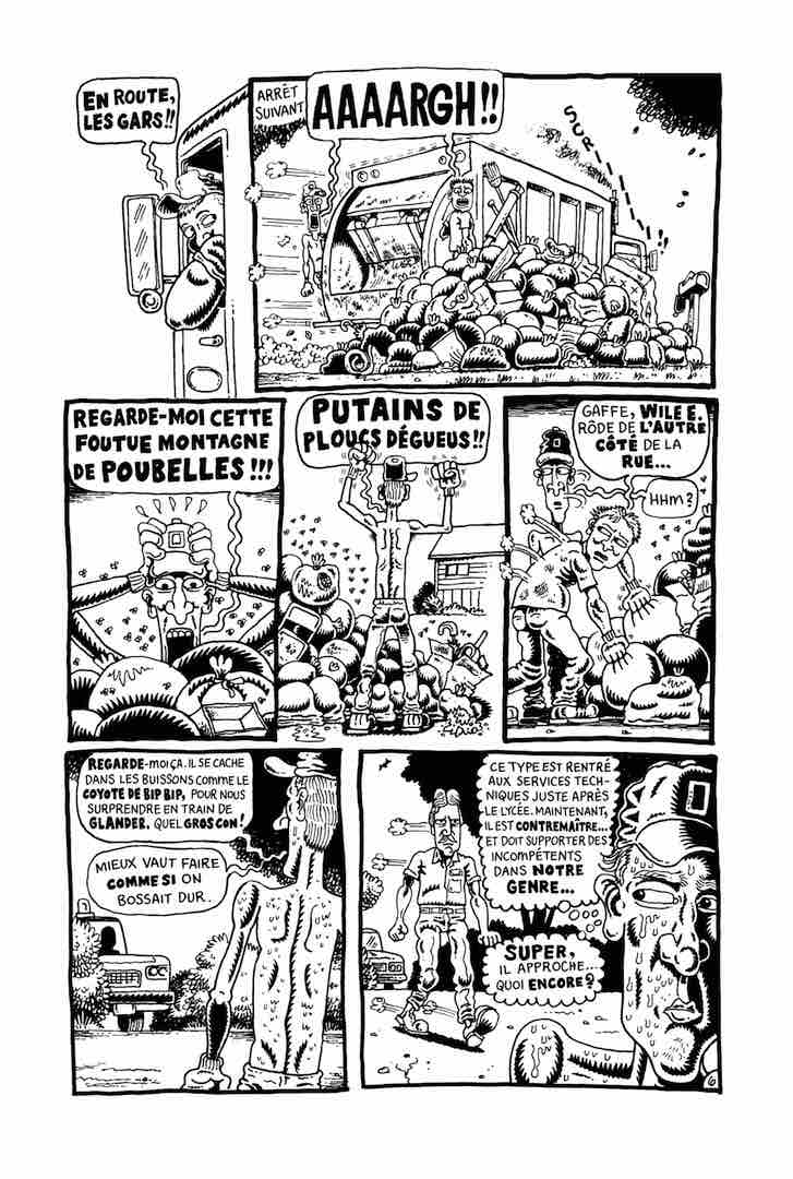 Derf Backderf prévient dans sa préface : « soyez gentil avec votre éboueur. Sinon, comme vous allez le découvrir dans ces pages, vous risqueriez de le regretter ». En effet, l’auteur montre que l’éboueur connaît bien les habitudes des habitants en fonctions des déchets qu’ils laissent, qu’il s’agisse de magazines pornographiques ou des restes périmés du réfrigérateur… Le dessinateur témoigne de façon drôle et très crue de son quotidien peu ragoûtant, fait d’aller-retour dans une décharge immonde, de rencontre avec des personnages totalement improbables et de mesquineries avec les « gars de la voirie » qui bizutent les jeunes éboueurs en coupant les poubelles ou en rajoutant des pierres à l’intérieur. Le dessin en noir et blanc et très expressif de Backderf – la case de « l’inspection anti-asticot » est un régal, si l’on ose dire – s’inscrit pleinement dans le style du fanzinat américain.