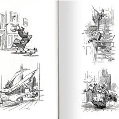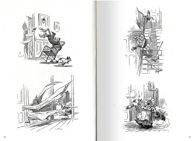 Ensuite, et ce n’est évidemment pas la moindre des raisons, le dessin d’Arthur Burdett Frost se révèle très impressionnant, notamment par sa maîtrise d’un trait toujours vif, extrêmement expressif et particulièrement à son aise dans la reproduction des attitudes des personnages en mouvement. Frost croque constamment avec une grande justesse des humains et des animaux qui courent, sautent, tombent… et il met magistralement en scène les situations auxquelles ils sont confrontés grâce à un sens aigu du découpage : ses enchaînements sont très bien rythmés, ne contenant aucun temps mort. Il n’est donc guère étonnant que le cinéma burlesque se soit inspiré des dessins de Frost pour certains films.