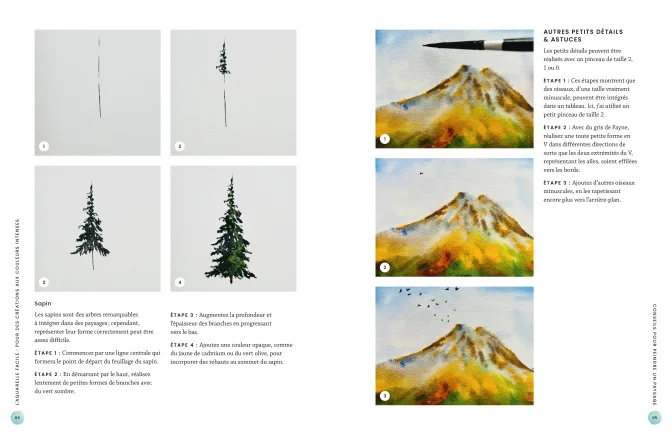 Puis vient la seconde partie, où l’on retrousse ses manches pour passer à l’action. D’abord, Geethu Chandramohan donne des conseils sur la réalisation de sujets généraux : le ciel, l’eau, la montagne... Puis viennent les projets, au nombre de quatorze, détaillés en six à huit étapes chacun. Ces peintures sont de plus en plus complexes. Elles font intervenir les méthodes apprises lors des créations précédentes, ce qui permet d’assimiler et de progresser.