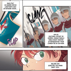 Critique : Il faut le reconnaître, ce webtoon romance-fantasy-médiévale a su esquiver chacun des a priori que je croyais avoir sur lui au fil de la lecture. Par exemple, ce sous-titre pour ce premier tome, "L’Amour est un champ de bataille", ainsi que le prologue montrant un Roi tombé amoureux, laissaient présager une histoire d’amour fleur bleue qui se tisse au fil des pages. Il n’en est rien car en dehors de ce passage, rien ne filtre sur les sentiments, de l’un comme de l’autre, du moins dans ce premier tome, si ce n’est un respect mutuel dans la ténacité et les capacités de l’autre. Les premiers chapitres montrent une fille déshéritée par ses parents, envoyée comme substitut pour combattre dans l’armée. De quoi envisager une trajectoire à la Mulan pour devenir Brienne de Torth, que l’on va voir se cacher, utiliser des subterfuges pour passer les épreuves et les étapes qui l’attendent. Là encore, pas du tout, puisqu’en quelques pages, la chevaleresse devient adulte, évite les écueils comme le viol ou les humiliations trop violentes (marcher derrière le chariot ne compte pas...). Alors, que reste-t-il dans ce premier volume ? Aussi inattendu que cela paraisse, de la stratégie militaire et des conseils de guerre sur la marche à suivre. Clairement, L’Armure et la Couronne tient davantage du RTS que de la romance, en tout cas sur ce premier tome.
