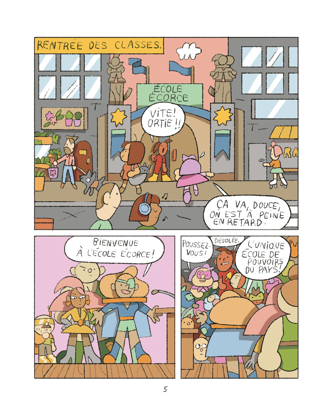Résumé : Ortie et Douce entrent à l’école Écorce, établissement qui forme super-héros et super-héroïnes. Au cours de l’année scolaire, elles doivent développer trois pouvoirs. Si Ortie a d’ores déjà la faculté de se transformer en chatte, Douce peut devenir invisible. Les deux amies composent avec leurs caractères et attentes très différents : Ortie, toujours prête à partir à l’aventure, voit des problèmes et des enquêtes potentielles partout ; Douce, plus posée et réservée, est attachée à la lecture.