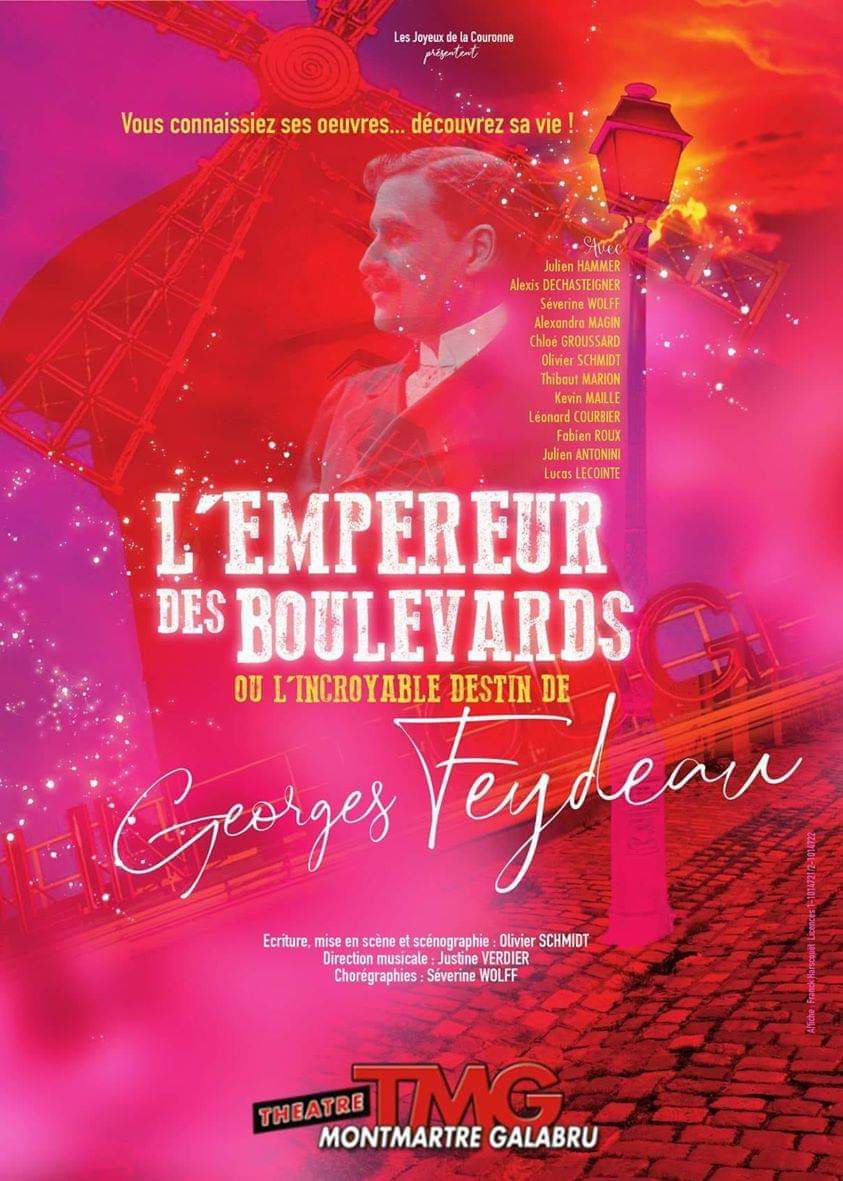 Résumé : Théâtre des Variétés. "Tailleur pour Dames" triomphe et marque le début de l’incroyable carrière d’un certain Georges Feydeau. Prisonnier de son irrépressible besoin de reconnaissance, l’Empereur des Boulevards déploie ses ailes sur un Paris festif et débonnaire. Partagé entre l’amour de sa femme, ses conquêtes nocturnes et ses personnages encombrants, Georges remonte le cours de sa vie et des illustres figures qui ont jalonné son parcours émaillé de promesses, de succès, d’échecs et de revanches. Des salons mondains de chez Maxim’s aux grandes scènes de la capitale, de son amitié avec les Guitry à sa rencontre funeste avec un ange de la nuit, de son apogée à sa disgrâce, faites un saut dans le temps, pour découvrir l’homme se cachant derrière l’auteur à succès. Un spectacle à vingt-six personnages, qui rend hommage au maître du genre, entre drame et comédie.