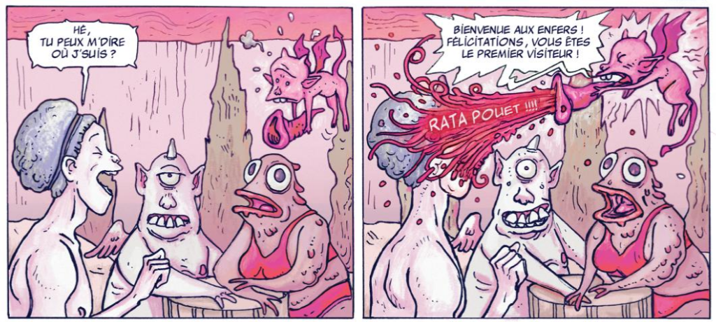 Le dessin ne fait pas exception à cette ambivalence : s’il offre au premier aspect quelque chose de sérieux, avec des Démons qui au premier abord ont l’air plutôt répugnants ou dérangeants, avec un Caïn décharné dans ce physique de jeune grec tourmenté aux yeux vitreux, Satan étant probablement celui qui inquiète le moins avec son costume d’Halloween rétro, le dessin fait rapidement voler en éclat cette illusion, d’une grimace ou d’un vomi bien placés pour annihiler l’effort précédent. Plutôt équilibré, l’ambiance oscille donc entre grotesque et horreur pour toujours finir dans la farce, avec efficacité et sagacité.