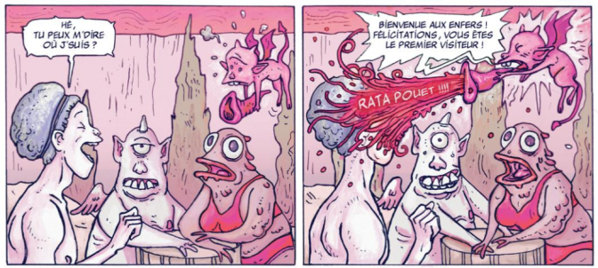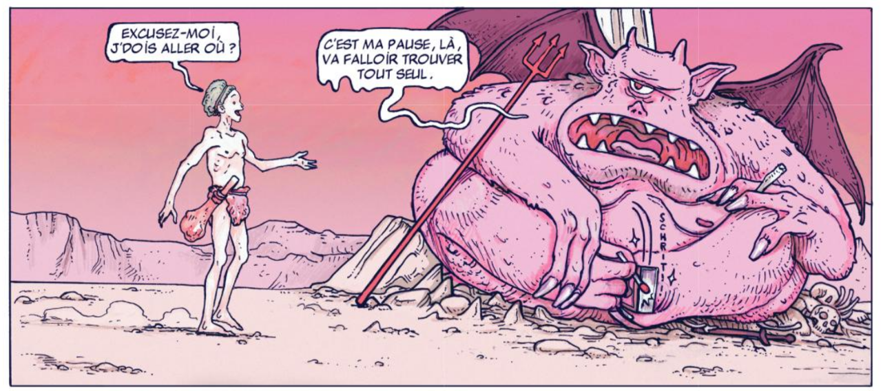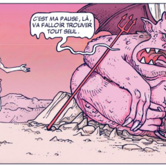 Critique : La collection Pataquès offre de bien beaux exemples pour arrêter de croire que l’humour, en particulier absurde, est mort avec Desproges. Karibou a choisi un sujet assez simple, celui que Dante Alighieri avait déjà un peu approché, une visite dépoussiérée des Enfers, pour leur inauguration en vérité, aux côtés non pas de Virgile mais d’un Caïn peu effarouché, pécheur assumé et plutôt amical avec les diablotins qui commencent leur nouveau job. Satan, en manager qui rappelle davantage The Office que Devil’s Advocate, joue le rôle de guide pour des planches à thème : culpabilité, châtiments, péchés capitaux, routine, efficacité... Chaque fois, un mot perdu, une secousse inattendue ou une réaction incongrue viennent mettre à mal l’atmosphère pourtant morbide ou sanguinolente qui est dessinée. Toutefois, le meilleur de ce recueil de blagues absurdes provient de son sens originel, caché par l’ironie, celui d’une connaissance épaisse, touffue, solide des écrits de l’Ancien Testament, des failles de la Genèse qui servent à décrire Satan et Lilith (peut-être pas assez mise en valeur), la Chute, les différents seigneurs des Abîmes, tout un récit qui est ici distillé à travers des gags qui racontent en vérité toujours quelque chose, et souvent que la Bible aime se contredire.