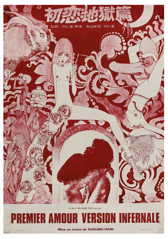 On retrouve ici son sens de la transgression dénuée de rage, comme innocente, son humour poignant, sa prédilection pour les jeux et rituels (le cache-cache des enfants masqués dans le cimetière), l’évocation sans détour, mais sans complaisance, de pratiques sexuelles déviantes, notamment lors d’une scène fameuse de séance de photos bondages et sadomasochistes, mais aussi son goût des expérimentations visuelles et sonores : ralentis, arrêts sur image, irruption soudaine de couleurs pimpantes (dans un ensemble en noir et blanc) lorsqu’un ami de la jeune fille, Algebra, projette un film amateur autobiographique en super 8 intitulé Premier amour , post-synchronisation volontairement décalée, citations musicales qui se mêlent aux très beaux motifs composés par Toru Takemitsu et Akio Yashiro.