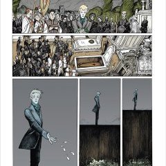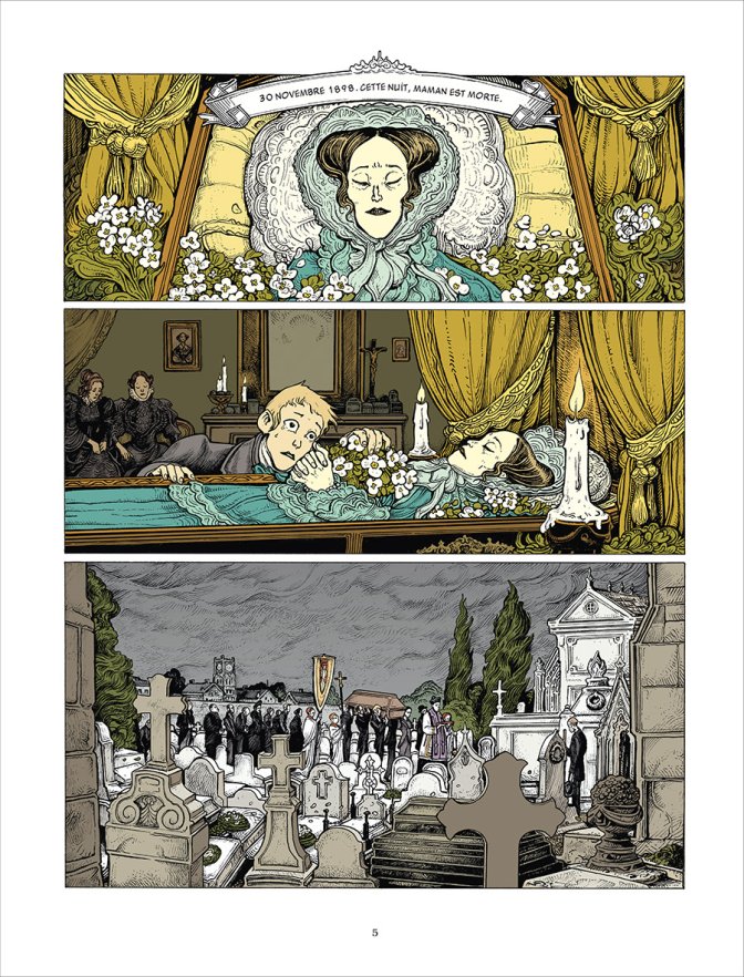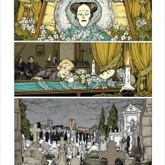 Si l’on se penche sur les plaisantes planches de Lionel Richerand, là aussi les échos de l’auteur d’Alice au pays des merveilles reviennent en tête, avec des personnages aux visages blafards et torturés, des yeux comme des abîmes et un bestiaire angoissant, où un renard empaillé s’éveille comme un ectoplasme déglingué. Les éléments perturbants sont là, dans chaque coin de page, qui créent une ambiance de siècle romantique, entre Chateaubriand et Poe, où les jours sont trop lents et les nuits trop courtes. Glaçant dans son ouverture, le manoir se dévoile chaque jour un peu plus, tandis que le cœur du héros s’entrouvre et se ferme successivement, au gré de l’amour, du désespoir ou de l’ambition. Le dessin a réussi à capter cette atmosphère légèrement insalubre, aussi bien des corps que des âmes, qui ne respirent pas la santé, physique ou psychique.
