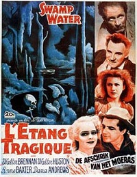 Le film : Premier des six longs métrages que Jean Renoir réalisa aux États-Unis, L’étang tragique connut une avant-première le 23 octobre 1941 en Géorgie (lieu du tournage) et sortit à New York un mois plus tard. Mais les Français devront attendre 1948 pour découvrir cette œuvre du cinéaste de La grande illusion et La règle du jeu, comme cela sera le cas pour la plupart des productions américaines tournées pendant la guerre. Le scénario, adaptation d’un roman de Vereen Bell, a été écrit par Dudley Nichols, un monument de Hollywood à qui l’on doit notamment les scripts de L’impossible Monsieur Bébé et La chevauchée fantastique. L’étang tragique fut aussi la première collaboration de Renoir avec Darryl F. Zanuck, le directeur de la production de la Twentieth Century Fox. Celui-ci ne comprenait pas pourquoi, outre le fait que le récit ne se déroulait pas en France, Renoir avait préféré opter pour un tournage en extérieurs, s’écartant ainsi de la norme d’un cinéma de studio. Le premier rôle féminin qui devait être joué par Linda Darnell échut finalement à Anne Baxter, la future Eve de Mankiewicz. Elle était entourée de Walter Brennan (le cowboy bourru des westerns de Ford et Hawks), Dana Andrews (Laura), Walter Huston (le père de John), Virginia Gilmore (future épouse de Yul Brynner), et ces merveilleux « acteurs de caractère » qu’étaient John Carradine, Eugene Pallette ou Ward Bond. Le film fut l’objet d’un remake, Prisonniers du marais, réalisé en 1952 par Jean Negulesco.