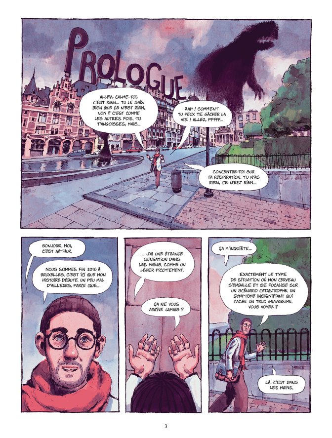 Plusieurs choses font que dès le début, il y a effectivement quelque chose de bizarre avec cet album : son titre tout d’abord, qui s’affiche sur la couverture comme si un rêve était pourtant décrit. Ses personnages ensuite, couple évidemment contraire mais qui fonctionne rapidement, et surtout, cette impression d’apocalypse à venir, grâce aux ressentis d’Arthur et aux possibilités d’un monstre géant façon Godzilla qui serait invisible mais prêt à bondir. Histoire d’amour mais aussi d’engagement, c’est lorsque le héros pénètre finalement dans un lieu éphémère et associatif que tout prend sens : il faut cesser de se lamenter pour agir, à petite touche, sans prétention, mais il existe des moyens de s’éveiller de ce cauchemar qu’est l’avenir. Sans le dire, cet ouvrage pose un regard romantique sur une réalité qui ne l’est hélas presque plus.
