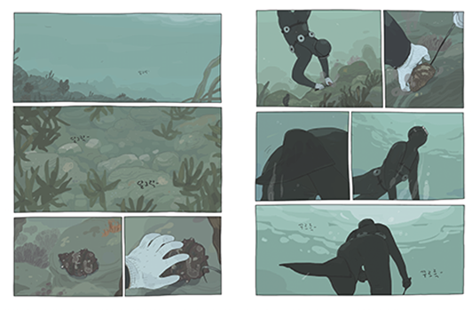 L’homme de la mer (Azure Spring en version originale) est le premier récit disponible en français de Jang Deok-Hyun. Celui-ci a d’abord été publié sur la plate-forme Delitoon, qui l’a révélé au grand public. Il signe un roman graphique contemplatif où les deux personnages principaux sont en quête de sens chacun à leur manière et font figure de marginaux dans une Corée du Sud où le travail et la productivité sont érigés en valeur morale. Anna symbolise cette jeunesse désemparée dans un système volontiers oppressant. Avec la découverte de l’exigence du métier d’haenyo, elle fait le choix de l’évasion.