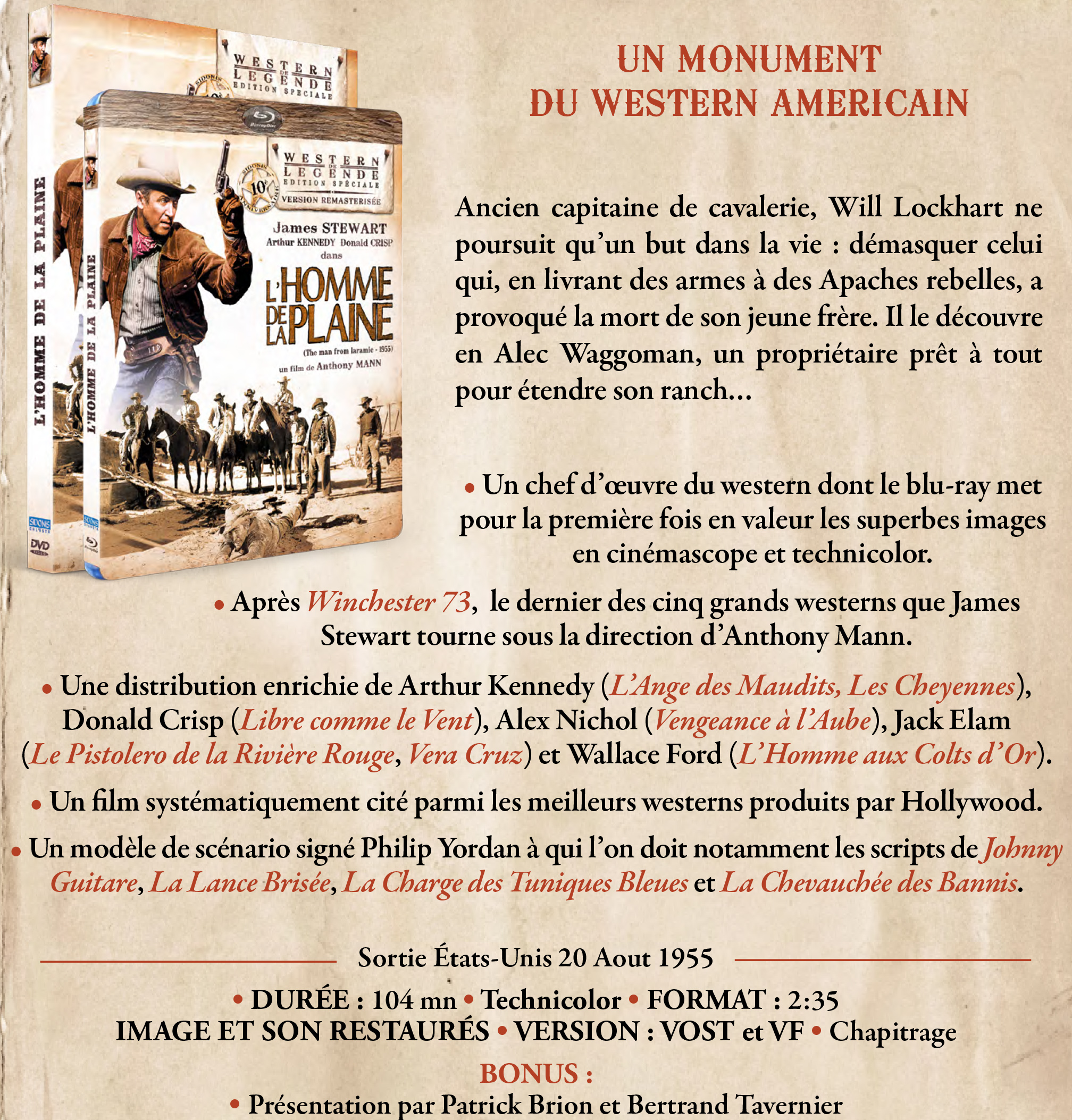 Le film : L’Homme de la plaine est le dernier des cinq westerns de Mann avec James Stewart et se présente comme une sorte de résumé des quatre autres avec lesquels il entretient nombre de correspondances. Ce n’est sans doute pas le meilleur, la faute sans doute à un scénario un peu trop chargé, mais on retrouve avec plaisir la mise en scène rectiligne du cinéaste, son sens du cadrage et sa direction d’acteurs impeccable. Pas un chef-d’œuvre, mais un grand western aux confins de la tragédie et du film noir.