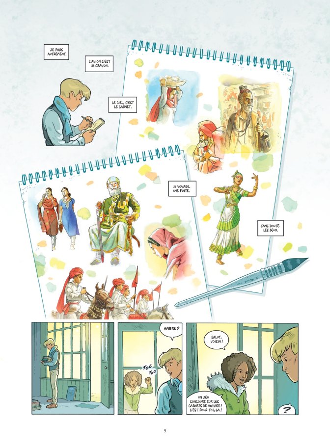 Notons aussi la présence de ce carnet à dessin. Max dessine pour voyager. Il représente, dans un trait plus réaliste, à l’aquarelle, les endroits qu’ils voudraient voir, et ses amis ou d’autres personnages croisés dans ces longues journées monotones. Ces feuilles de dessins s’insèrent merveilleusement bien dans la BD et nous rapprochent de Max. Les couleurs plus vives sont différentes et apportent le contraste avec le dessin des cases.