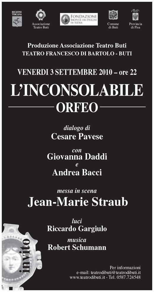 Ouvrant le deuxième volet du programme*, L’inconsolable, variation désabusée sur le mythe d’Orphée, poursuit l’exploration des Dialoghi con Leucò entamée en 1978 avec De la nuée à la résistance et complétée en plusieurs étapes dans les dernières années, toujours avec les acteurs du Théâtre de Buti en Toscane.