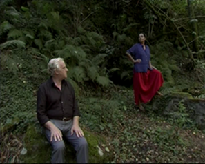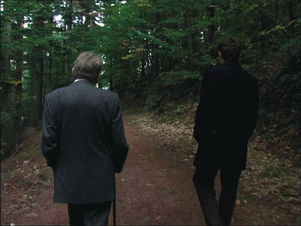 Tourné au pied du mont Saint Odile, Un Héritier nous fait entendre un autre texte de Barrès, extrait de Au service de l’Allemagne (1903), récit d’un médecin de campagne dans l’Alsace annexée. Ici aussi la violence des mots contraste avec la paisible atmosphère estivale et le ton de conversation amicale d’une promenade sur un chemin de forêt au pied su mont Sainte-Odile, la caméra suivant les deux interlocuteurs filmés de dos (dont Straub lui-même, alias Jubarite Semaran, pseudo déjà utilisé dans Othon), d’une pause à la terrasse d’un café ou d’une lecture face à la caméra. La simplicité et l’évidence de la mise en scène donnent presque une impression d’improvisation, en tout cas de légèreté bien éloignée de la soit-disant rigidité qu’on associe souvent à ce cinéma.
